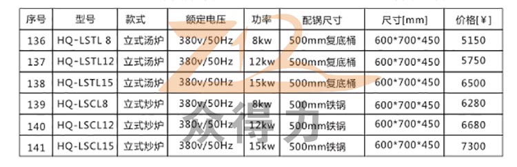 立式湯爐及炒爐相關技術參數及統一報價:
